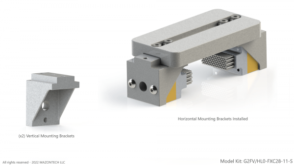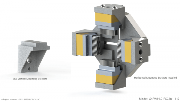 We also offer exchangeable brackets to mount the FlexClamps horizontally or vertically oriented, and many lengths for long reach cases. In addition, customizable apertures can be achieved with different guide plates. Contact us with your particular enquire.